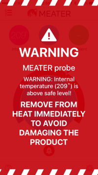 As we mentioned earlier, the way that MEATER keeps its delicate electronics safe from heat is they locate them in the probe shaft where they will be protected by the meat you are cooking. But the electronics can only take so much heat, and obviously when we put the probe in boiling water, we are exceeding any reasonable temperature for a piece of cooking meat. The result is that you get the "Dive! Dive! Dive!" sound effect and the red screen of death warning you to take immediate action.