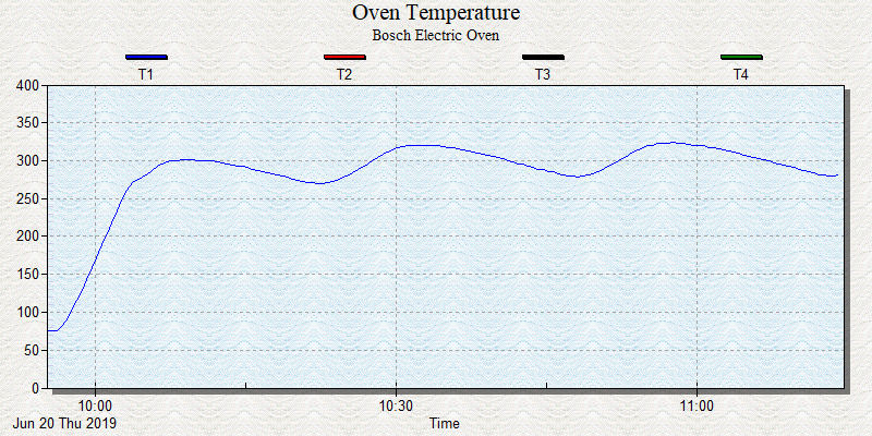 As you can see, at room temperature and in ice water, all the probes were reasonably close to accurate. The only thing that stands out is that the food probes were both 3.2°F high when measuring the temperature of boiling water, and the pit probe was 1.0°F high in the ice bath. While this is well outside the accuracy limit of most thermistors, it probably isn't a concern considering the temperatures used for barbecue. When you look at the accuracy that is typical of most kitchen ovens, you'll find up to a 50°F temperature swing. In this light, 3.2°F is a tiny blip. How tiny? Well here is how well our $2200 Bosch oven holds 300°F. That's a 43°F swing on the last oscillation. Again, an error of a few degrees on your temperatures is irrelevant. :