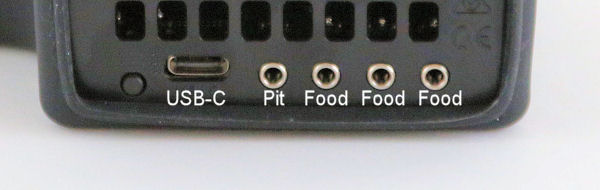 All the connections are on the bottom edge of the control unit. From left to right are the USB-C plug and the plugs for the pit probe and 3 meat probes. Only 2 food probes are supplied with the Primo Plus, while 3 are supplied with the Smartfire. (Note: We photoshopped in the labels for the sake of clarity. There are tiny labels molded into the plastic grate.)