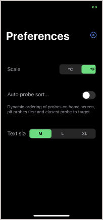 7. Preferences: Here you can select the temperature units, whether or not to auto-sort the probes on the "Home" screen, and the text size. |