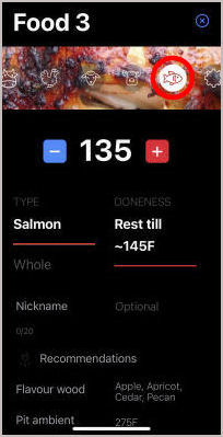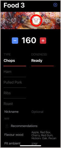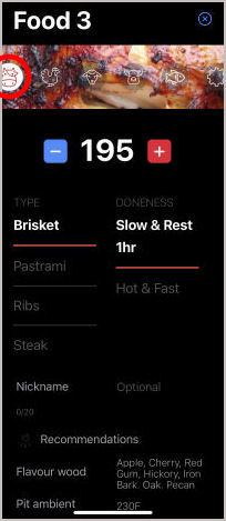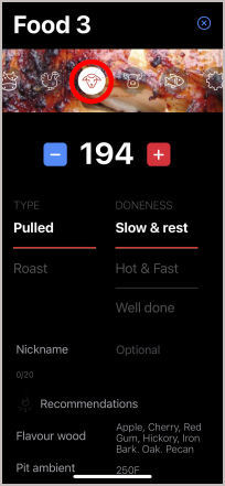 2. Here you can select the type of meat (Beef), the cut, doneness, give the probe a nickname and view cooking recommendations. |
